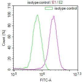 Overlay Peak curve showing MCF7 cells stained with CSB-RA179313A0HU (red line) at 1:100. The cells were fixed in 4% formaldehyde and permeated by 0.2% TritonX-100. Then 10% normal goat serum to block non-specific protein-protein interactions followed by the antibody (1ug/1*106cells) for 45min at 4℃. The secondary antibody used was FITC-conjugated Goat Anti-rabbit IgG(H+L) at 1:200 dilution for 35min at 4℃.Control antibody (green line) was rabbit IgG (1ug/1*106cells) used under the same conditions. Acquisition of >10,000 events was performed.