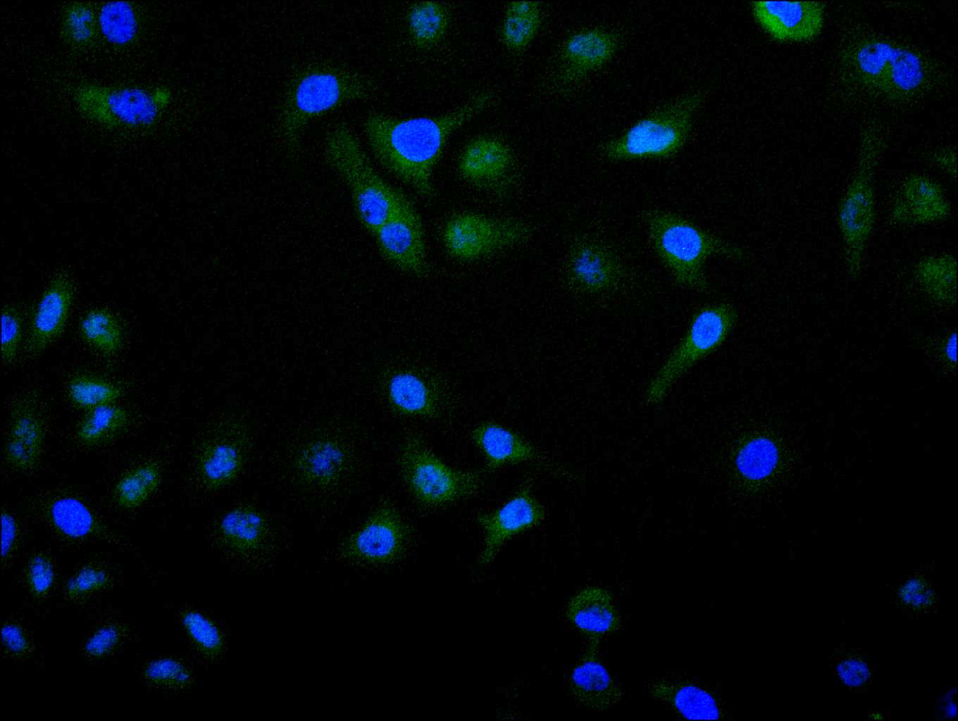 Immunofluorescence staining of Hela cell with CSB-RA555528A0HU at 1:50, counter-stained with DAPI. The cells were fixed in 4% formaldehyde, permeabilized using 0.2% Triton X-100 and blocked in 10% normal Goat Serum. The cells were then incubated with the antibody overnight at 4°C. The secondary antibody was Alexa Fluor 488-congugated AffiniPure Goat Anti-Rabbit IgG(H+L).
