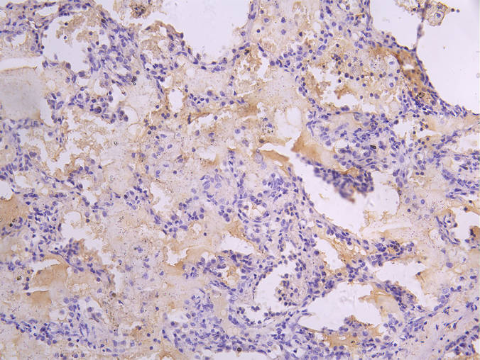 IHC image of CSB-RA008645MA1HU diluted at 1:100 and staining in paraffin-embedded 肺癌 performed on a Leica BondTM system. After dewaxing and hydration, antigen retrieval was mediated by high pressure in a citrate buffer (pH 6.0). Section was blocked with 10% normal goat serum 30min at RT. Then primary antibody (1% BSA) was incubated at 4°C overnight. The primary is detected by a Goat anti-human polymer IgG labeled by HRP and visualized using 0.05% DAB.