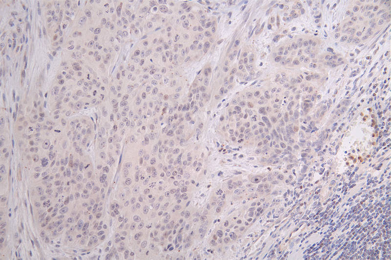 IHC image of CSB-RA148519A0HU diluted at 1:100 and staining in paraffin-embedded human gastric cancer performed on a Leica BondTM system. After dewaxing and hydration, antigen retrieval was mediated by high pressure in a citrate buffer (pH 6.0). Section was blocked with 10% normal goat serum 30min at RT. Then primary antibody (1% BSA) was incubated at 4°C overnight. The primary is detected by a Goat anti-rabbit polymer IgG labeled by HRP and visualized using 0.09% DAB.