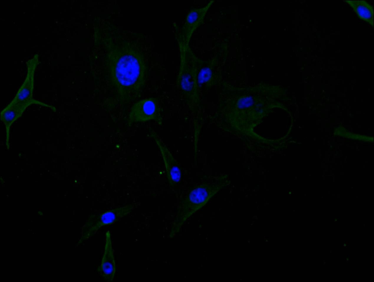 Immunofluorescence staining of U87 cell with CSB-RA009369MA1HU at 1:200, counter-stained with DAPI. The cells were fixed in 4% formaldehyde and blocked in 10% normal Goat Serum. The cells were then incubated with the antibody overnight at 4C. The secondary antibody was FITC-conjugated AffiniPure Goat Anti-Mouse IgG(H+L).