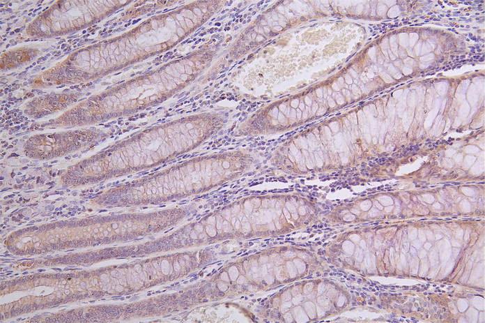 IHC image of CSB-RA950991A0HU diluted at 1:100 and staining in paraffin-embedded human rectal cancer performed on a Leica BondTM system. After dewaxing and hydration, antigen retrieval was mediated by high pressure in a citrate buffer (pH 6.0). Section was blocked with 10% normal goat serum 30min at RT. Then primary antibody (1% BSA) was incubated at 4°C overnight. The primary is detected by a Goat anti-rabbit polymer IgG labeled by HRP and visualized using 0.14% DAB.
