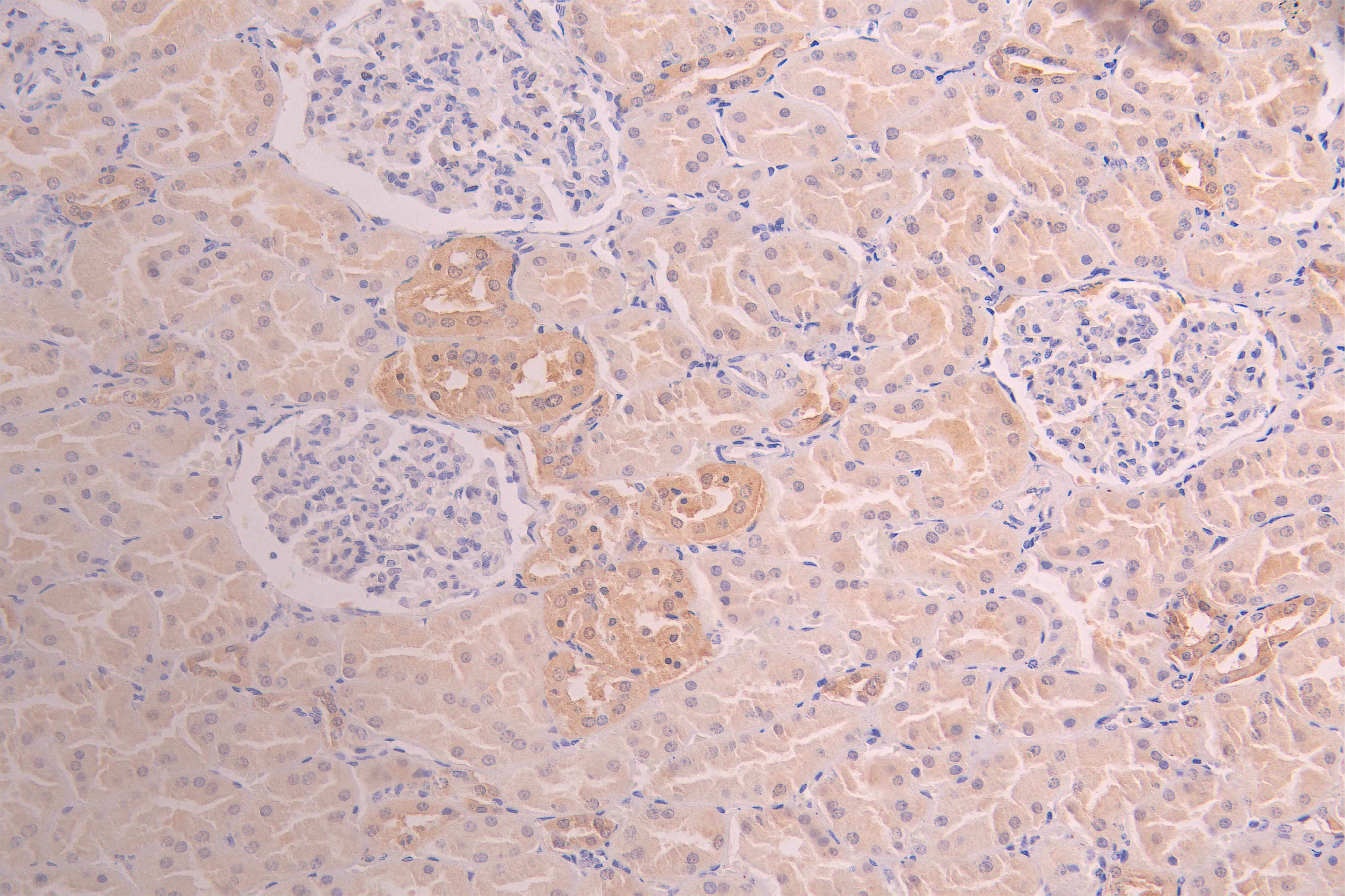 IHC image of CSB-RA009982MA1HU diluted at 1:100 and staining in paraffin-embedded human kidney tissue performed on a Leica BondTM system. After dewaxing and hydration, antigen retrieval was mediated by high pressure in a citrate buffer (pH 6.0). Section was blocked with 10% normal goat serum 30min at RT. Then primary antibody (1% BSA) was incubated at 4°C overnight. The primary is detected by a Goat anti-human polymer IgG labeled by HRP and visualized using 0.05% DAB.