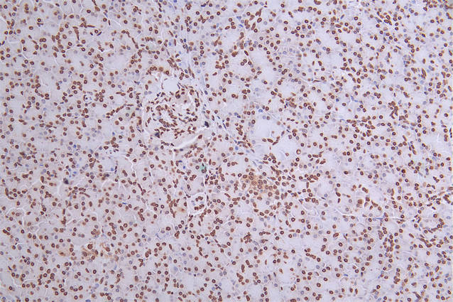IHC image of CSB-RA034362A0HU diluted at 1:50 and staining in paraffin-embedded human pancreati tissue performed on a Leica BondTM system. After dewaxing and hydration, antigen retrieval was mediated by high pressure in a citrate buffer (pH 6.0). Section was blocked with 10% normal goat serum 30min at RT. Then primary antibody (1% BSA) was incubated at 4°C overnight. The primary is detected by a Goat anti-rabbit polymer IgG labeled by HRP and visualized using 0.27% DAB.