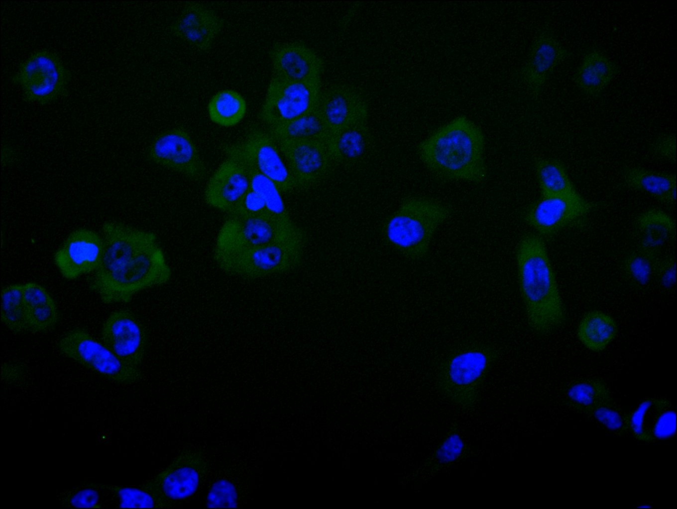 Immunofluorescence staining of MCF-7 cell with CSB-RA733162MA1HU at 1:30 ,counter-stained with DAPI. The cells were fixed in 4% formaldehyde and blocked in 10% normal Goat Serum. The cells were then incubated with the antibody overnight at 4°C. The secondary antibody was Fluorescein (FITC) AffiniPure Goat Anti-Human IgG, Fcγ fragment specific.