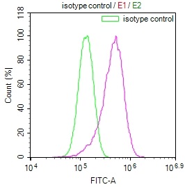 Overlay Peak curve showing HepG2 cells stained with CSB-RA937491A0HU (red line) at 1:100. The cells were fixed in 4% formaldehyde and permeated by 0.2% TritonX-100. Then 10% normal goat serum to block non-specific protein-protein interactions followed by the antibody (1ug/1*106cells) for 45min at 4℃. The secondary antibody used was FITC-conjugated Goat Anti-rabbit IgG(H+L) at 1:200 dilution for 35min at 4℃.Control antibody (green line) was rabbit IgG (1ug/1*106cells) used under the same conditions. Acquisition of >10,000 events was performed.
