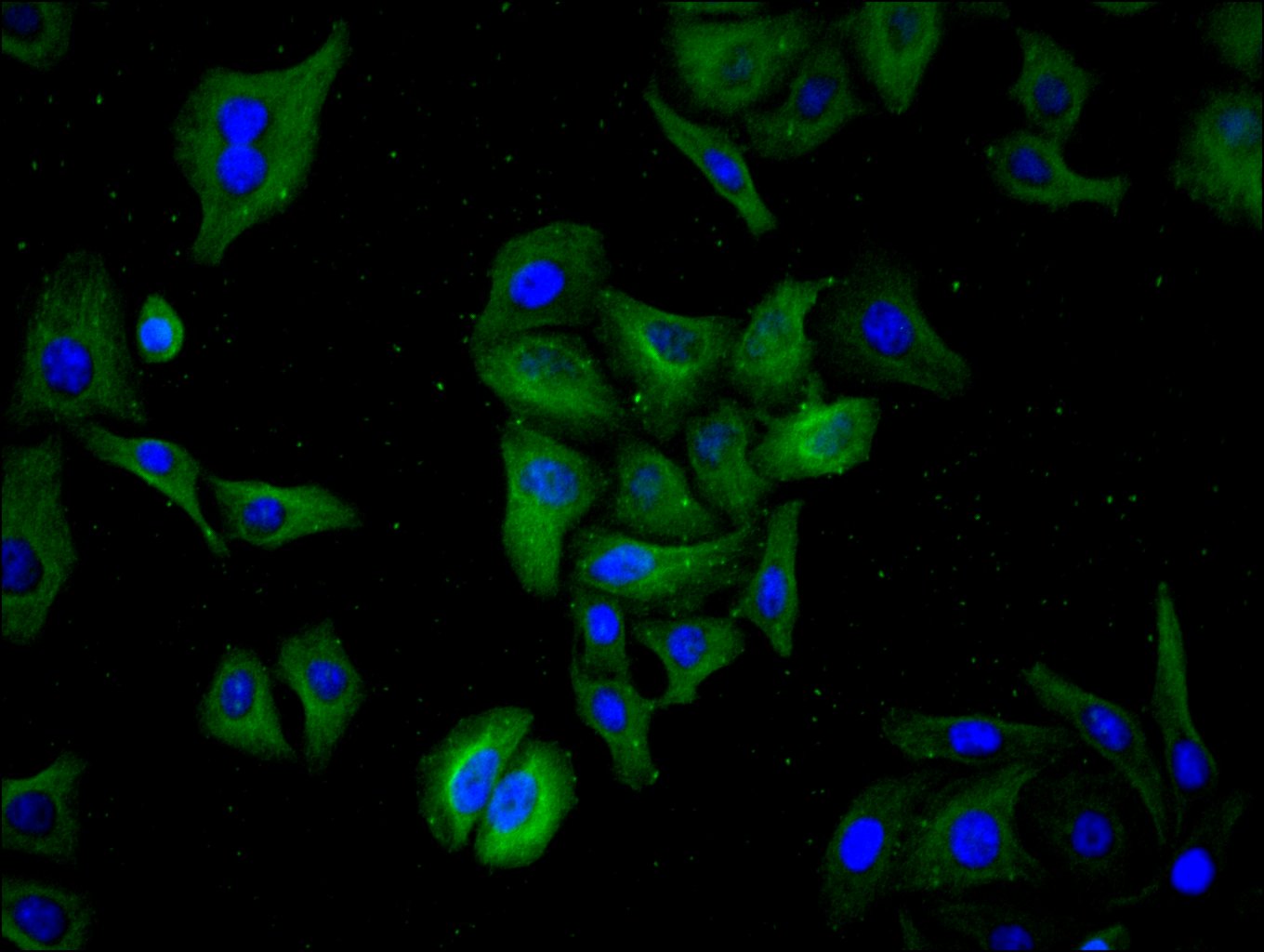 Immunofluorescence staining of Hela cell with CSB-RA833609A0HU at 1:50, counter-stained with DAPI. The cells were fixed in 4% formaldehyde, permeabilized using 0.2% Triton X-100 and blocked in 10% normal Goat Serum. The cells were then incubated with the antibody overnight at 4°C. The secondary antibody was Alexa Fluor 488-congugated AffiniPure Goat Anti-Rabbit IgG(H+L).