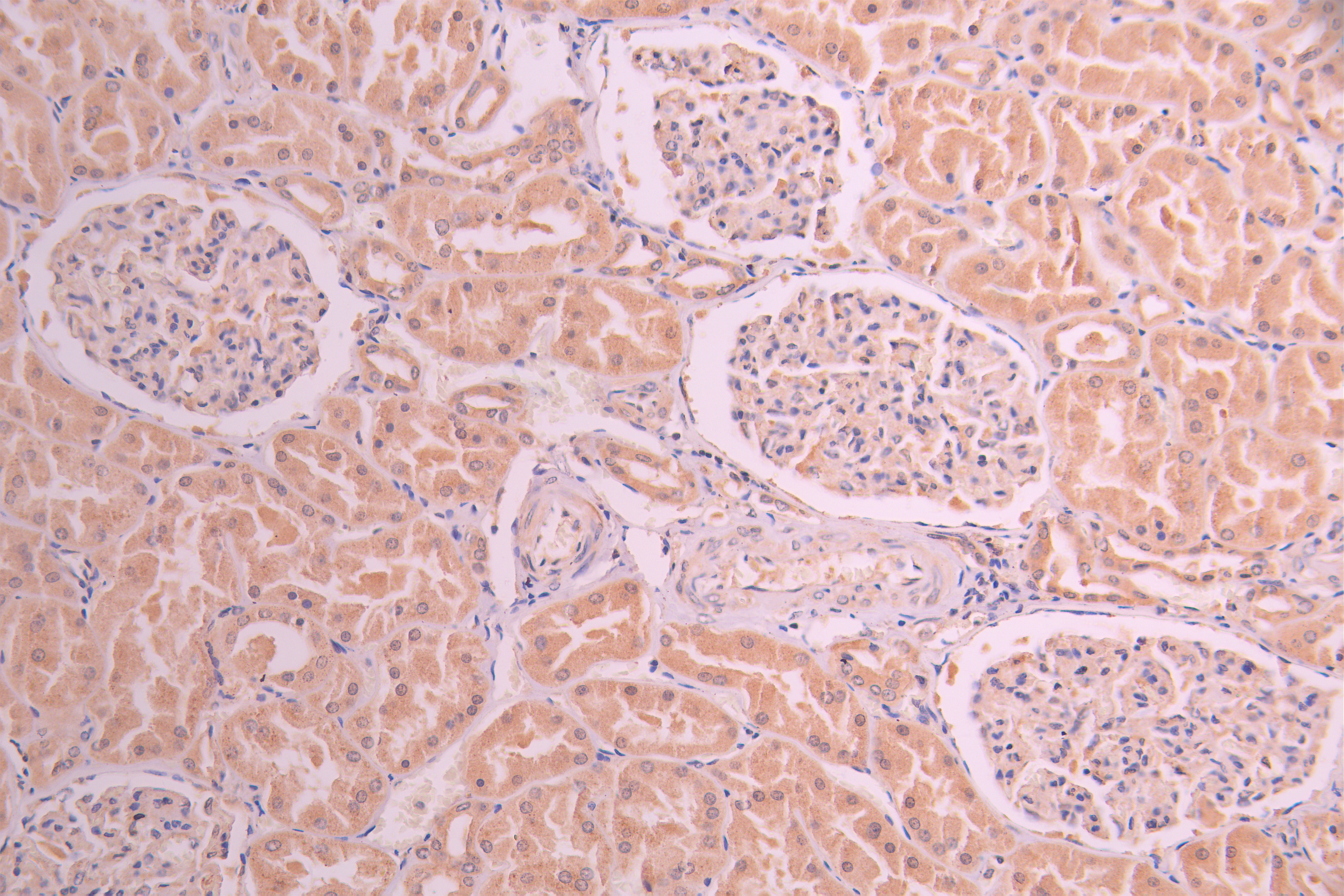 IHC image of CSB-RA944336A0HU diluted at 1:100 and staining in paraffin-embedded human kidney tissue performed on a Leica BondTM system. After dewaxing and hydration, antigen retrieval was mediated by high pressure in a citrate buffer (pH 6.0). Section was blocked with 10% normal goat serum 30min at RT. Then primary antibody (1% BSA) was incubated at 4°C overnight. The primary is detected by a Goat anti-rabbit polymer IgG labeled by HRP and visualized using 0.05% DAB.