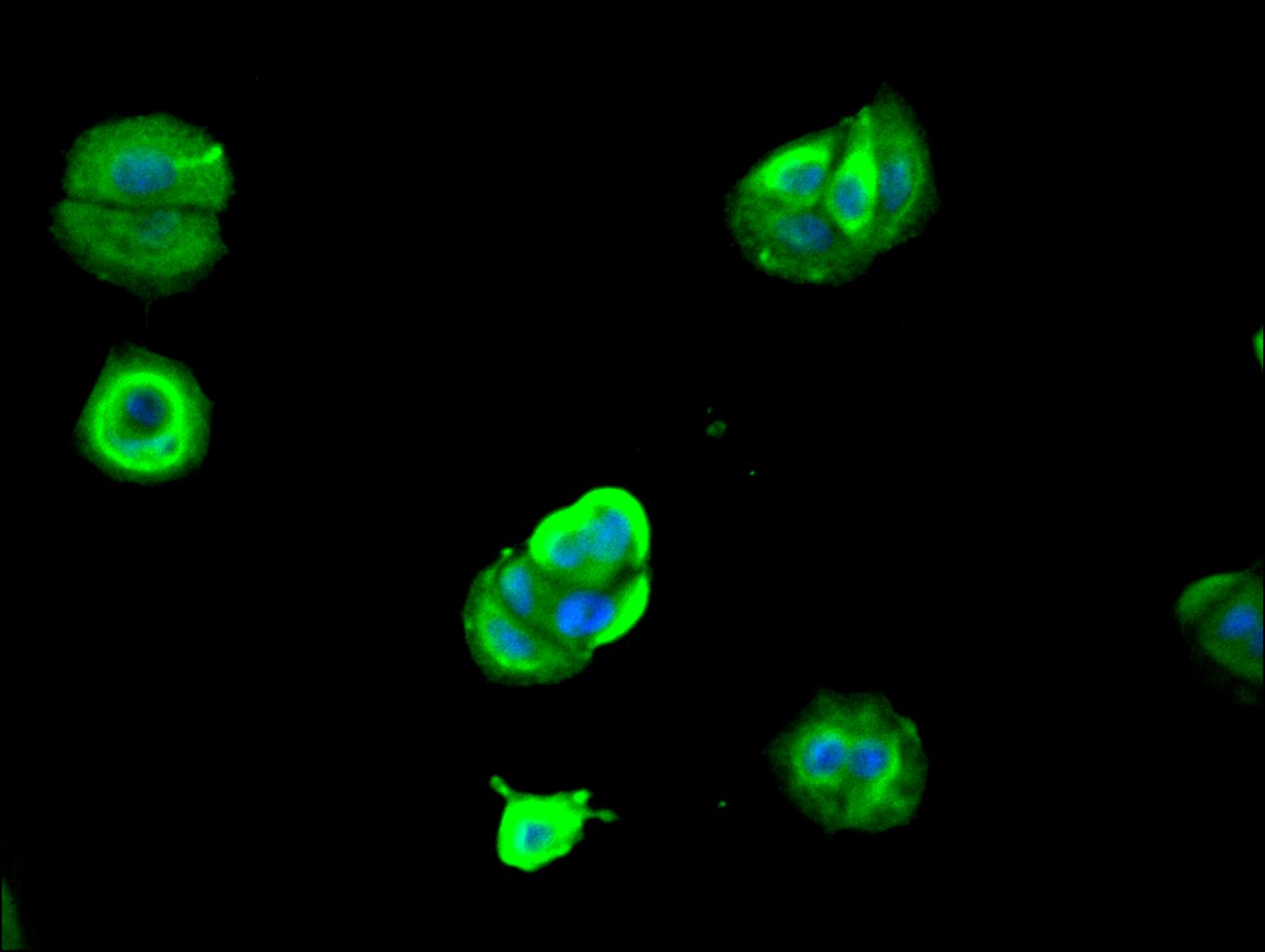 Immunofluorescence staining of MCF-7 cell with CSB-RA441361A0HU at 1:50, counter-stained with DAPI. The cells were fixed in 4% formaldehyde, permeabilized using 0.2% Triton X-100 and blocked in 10% normal Goat Serum. The cells were then incubated with the antibody overnight at 4°C. The secondary antibody was Alexa Fluor 488-congugated AffiniPure Goat Anti-Rabbit IgG(H+L).