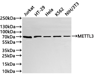 Positive WB detected in: Jurkat whole cell lysate(30μg),HT-29 whole cell lysate(30μg),Hela whole cell lysate(30μg),K562 whole cell lysate(30μg),NIH/3T3 whole cell lysate(30μg)
