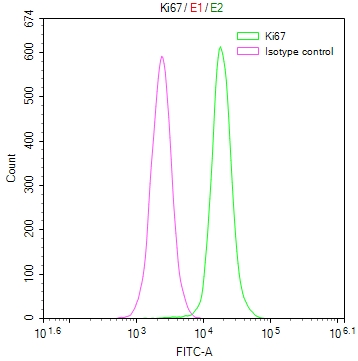 Overlay Peak curve showing Hela cells stained with CSB-RA984483A0HU (red line) at 1:50. The cells were fixed in 4% formaldehyde and permeated by 0.2% TritonX-100. Then 10% normal goat serum to block non-specific protein-protein interactions followed by the antibody (1μg/1*106cells) for 45min at 4℃. The secondary antibody used was FITC-conjugated Goat Anti-rabbit IgG(H+L) at 1:200 dilution for 35min at 4℃.Control antibody (green line) was rabbit IgG (1μg/1*106cells) used under the same conditions. Acquisition of >10,000 events was performed.