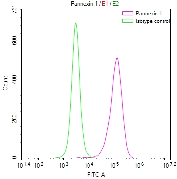 Overlay Peak curve showing A549 cells surface stained with CSB-RA549607A0HU (red line) at 1:50. Then 10% normal goat serum to block non-specific protein-protein interactions followed by the antibody (1μg/1*106cells) for 45min at 4℃. The secondary antibody used was FITC-conjugated Goat Anti-rabbit IgG(H+L) at 1:200 dilution for 35min at 4℃.Control antibody (green line) was rabbit IgG (1μg/1*106cells) used under the same conditions. Acquisition of >10,000 events was performed.