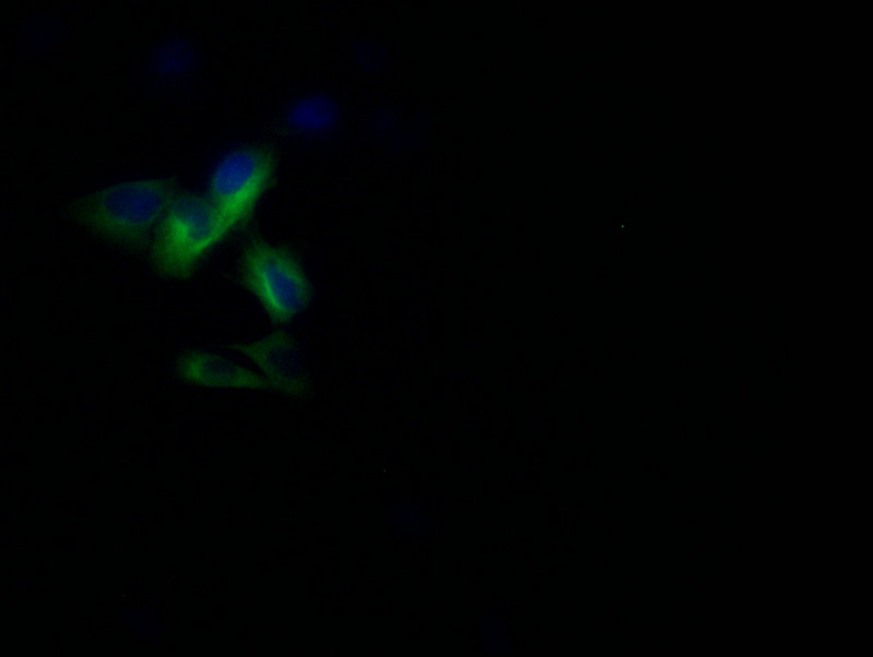 Immunofluorescence staining of U251 with CSB-RA549607A0HU at 1:10, counter-stained with DAPI. The cells were fixed in 4% formaldehyde and blocked in 10% normal Goat Serum. The cells were then incubated with the antibody overnight at 4°C. The secondary antibody was Alexa Fluor 502-congugated AffiniPure Goat Anti-Rabbit IgG(H+L).