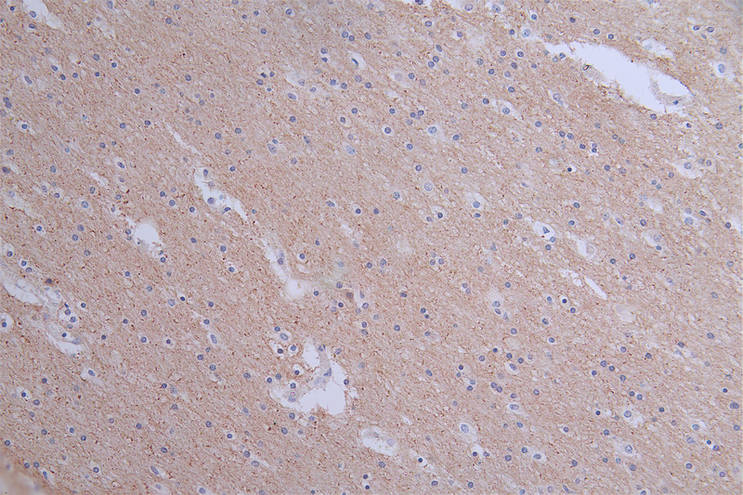 IHC image of CSB-RA549607A0HU diluted at 1:50 and staining in paraffin-embedded human brain tissue performed on a Leica BondTM system. After dewaxing and hydration, antigen retrieval was mediated by high pressure in a citrate buffer (pH 6.0). Section was blocked with 10% normal goat serum 30min at RT. Then primary antibody (1% BSA) was incubated at 4°C overnight. The primary is detected by a Goat anti-rabbit polymer IgG labeled by HRP and visualized using 0.1:50% DAB.