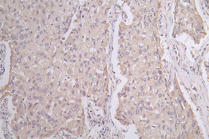 IHC image of CSB-RA549607A0HU diluted at 1:50 and staining in paraffin-embedded human lung cancer performed on a Leica BondTM system. After dewaxing and hydration, antigen retrieval was mediated by high pressure in a citrate buffer (pH 6.0). Section was blocked with 10% normal goat serum 30min at RT. Then primary antibody (1% BSA) was incubated at 4°C overnight. The primary is detected by a Goat anti-rabbit polymer IgG labeled by HRP and visualized using 0.1:50% DAB.