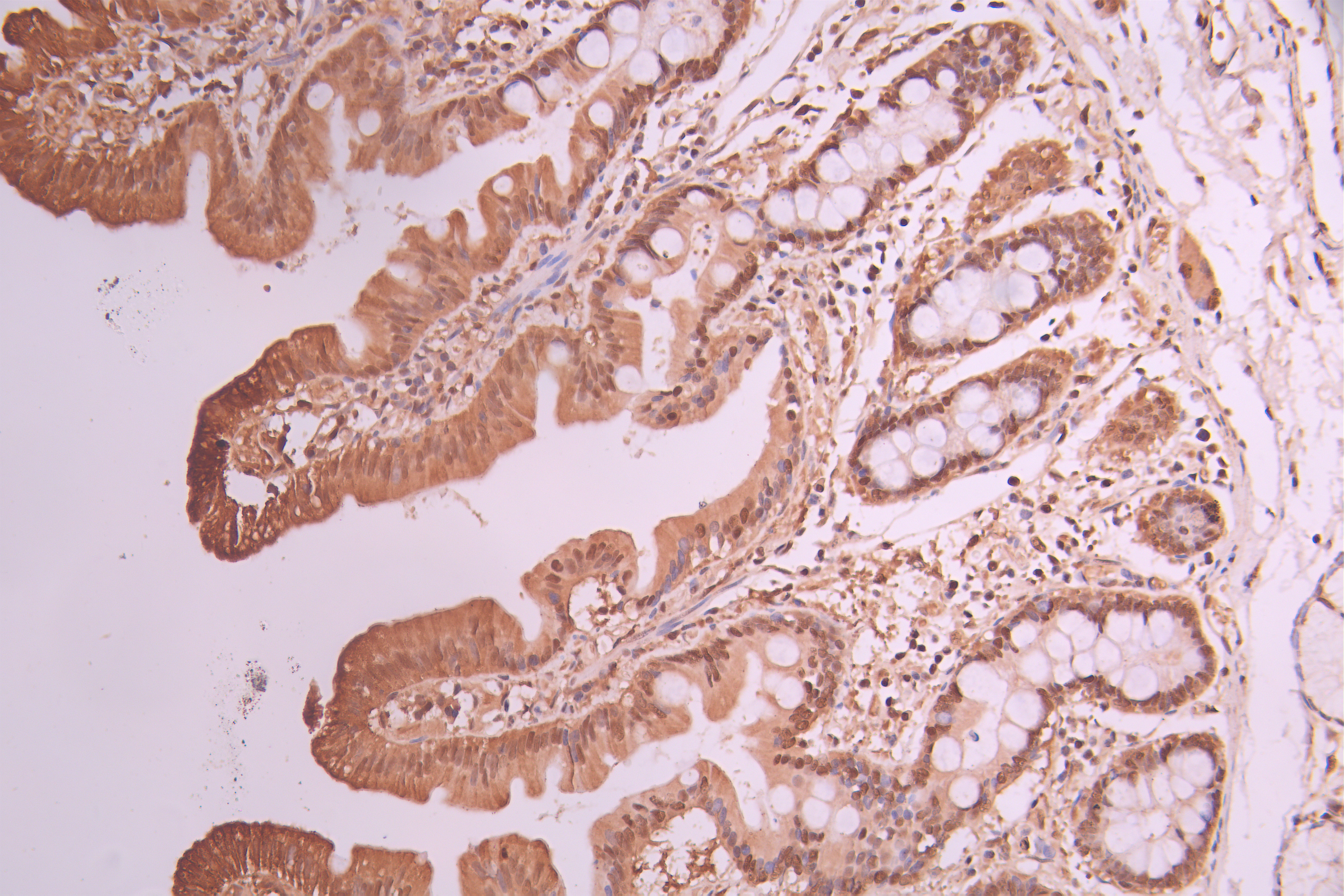 IHC image of CSB-RA276081A0HU diluted at 1:100 and staining in paraffin-embedded human small intestine tissue performed on a Leica BondTM system. After dewaxing and hydration, antigen retrieval was mediated by high pressure in a citrate buffer (pH 6.0). Section was blocked with 10% normal goat serum 30min at RT. Then primary antibody (1% BSA) was incubated at 4°C overnight. The primary is detected by a Goat anti-rabbit polymer IgG labeled by HRP and visualized using 0.05% DAB.
