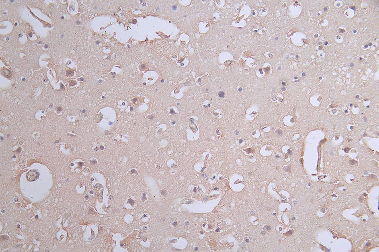 IHC image of CSB-RA017450A0HU diluted at 1:50 and staining in paraffin-embedded human brain tissue performed on a Leica BondTM system. After dewaxing and hydration, antigen retrieval was mediated by high pressure in a citrate buffer (pH 6.0). Section was blocked with 10% normal goat serum 30min at RT. Then primary antibody (1% BSA) was incubated at 4°C overnight. The primary is detected by a Goat anti-rabbit polymer IgG labeled by HRP and visualized using 0.62% DAB.