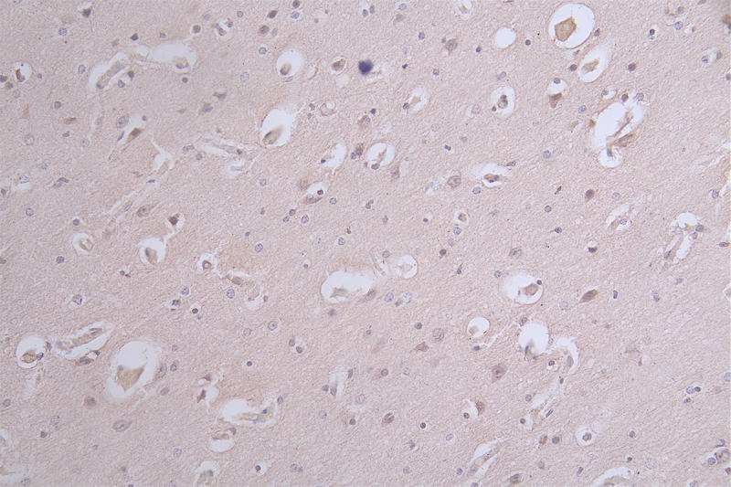 IHC image of CSB-RA050476A0HU diluted at 1:100 and staining in paraffin-embedded human brain tissue performed on a Leica BondTM system. After dewaxing and hydration, antigen retrieval was mediated by high pressure in a citrate buffer (pH 6.0). Section was blocked with 10% normal goat serum 30min at RT. Then primary antibody (1% BSA) was incubated at 4°C overnight. The primary is detected by a Goat anti-rabbit polymer IgG labeled by HRP and visualized using 0.12% DAB.
