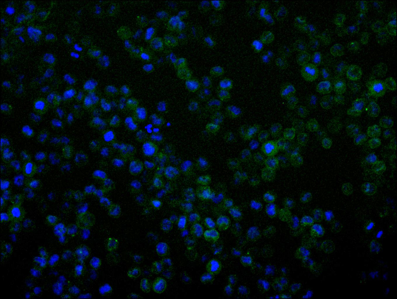 Immunofluorescence staining of K-562 cell with CSB-RA922439A0HU at 1:50, counter-stained with DAPI. The cells were fixed in 4% formaldehyde, permeabilized using 0.2% Triton X-100 and blocked in 10% normal Goat Serum. The cells were then incubated with the antibody overnight at 4°C. The secondary antibody was Alexa Fluor 488-congugated AffiniPure Goat Anti-Rabbit IgG(H+L).