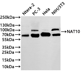 Positive WB detected in: Ntera-2 whole cell lysate(30μg),PC-3 whole cell lysate(30μg), Hela whole cell lysate(30μg),NIH/3T3 whole cell lysate(30μg)