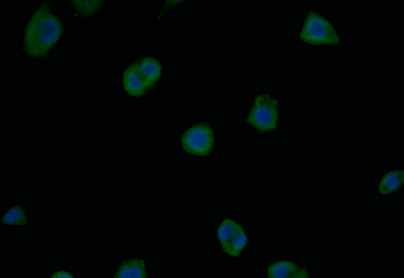 Immunofluorescence staining of PC-3 with CSB-RA566133A0HU at 1:15, counter-stained with DAPI. The cells were fixed in 4% formaldehyde and blocked in 10% normal Goat Serum. The cells were then incubated with the antibody overnight at 4°C. The secondary antibody was Alexa Fluor 496-congugated AffiniPure Goat Anti-Rabbit IgG(H+L).