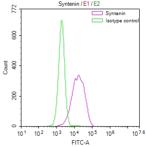 Overlay Peak curve showing HepG2 cells stained with CSB-RA248860A0HU (red line) at 1:50. The cells were fixed in 4% formaldehyde and permeated by 0.2% TritonX-100. Then 10% normal goat serum to block non-specific protein-protein interactions followed by the antibody (1μg/1*106cells) for 45min at 4℃. The secondary antibody used was FITC-conjugated Goat Anti-rabbit IgG(H+L) at 1:200 dilution for 35min at 4℃.Control antibody (green line) was rabbit IgG (1μg/1*106cells) used under the same conditions. Acquisition of >10,000 events was performed.