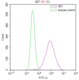 功能:Multitasking protein, involved in apoptosis, transcription, nucleosome assembly and histone chaperoning. Isoform 2 anti-apoptotic activity is mediated by inhibition of the GZMA-activated DNase, NME1. In the course of cytotoxic T-lymphocyte (CTL)-induced apoptosis, GZMA cleaves SET, disrupting its binding to NME1 and releasing NME1 inhibition. Isoform 1 and isoform 2 are potent inhibitors of protein phosphatase 2A. Isoform 1 and isoform 2 inhibit EP300/CREBBP and PCAF-mediated acetylation of histones (HAT) and nucleosomes, most probably by masking the accessibility of lysines of histones to the acetylases. The predominant target for inhibition is histone H4. HAT inhibition leads to silencing of HAT-dependent transcription and prevents active demethylation of DNA. Both isoforms stimulate DNA replication of the adenovirus genome complexed with viral core proteins; however, isoform 2 specific activity is higher.