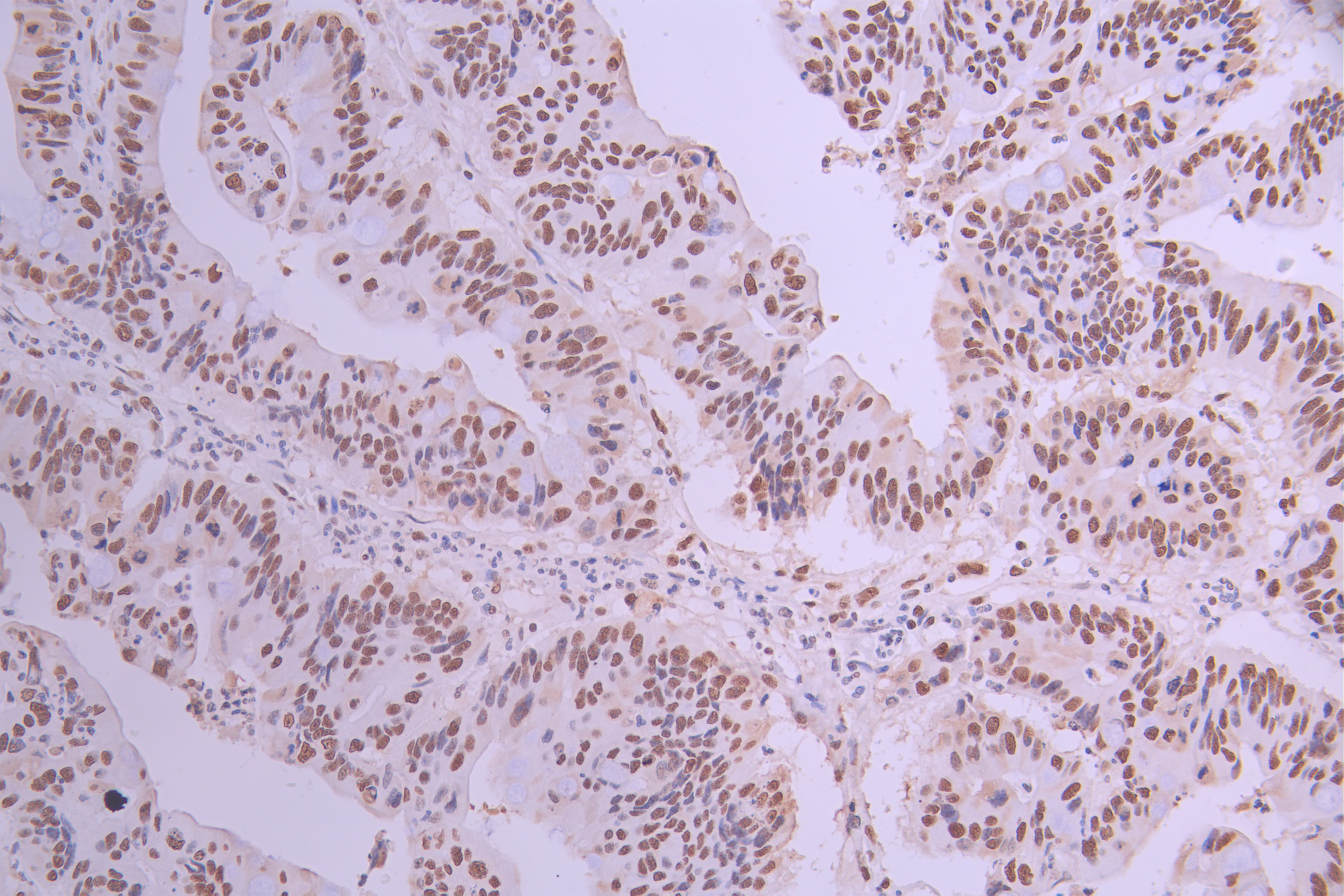 IHC image of CSB-RA561645A0HU diluted at 1:100 and staining in paraffin-embedded human colorectal cancer performed on a Leica BondTM system. After dewaxing and hydration, antigen retrieval was mediated by high pressure in a citrate buffer (pH 6.0). Section was blocked with 10% normal goat serum 30min at RT. Then primary antibody (1% BSA) was incubated at 4°C overnight. The primary is detected by a Goat anti-rabbit polymer IgG labeled by HRP and visualized using 0.05% DAB.
