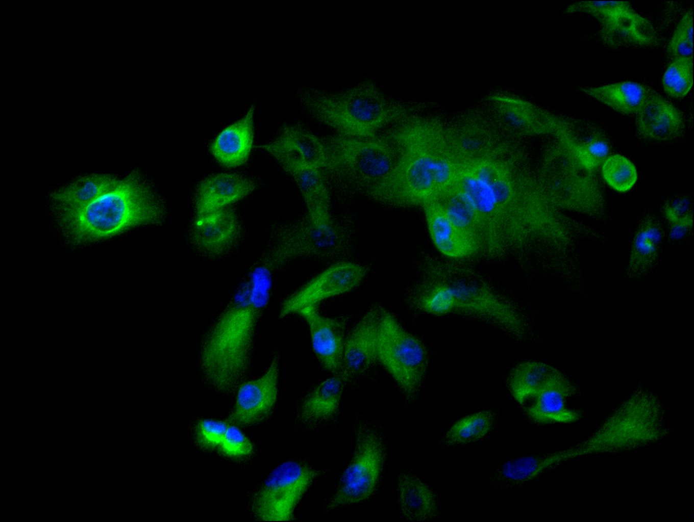 Immunofluorescence staining of HepG2 cell with CSB-RA297595A0HU at 1:50, counter-stained with DAPI. The cells were fixed in 4% formaldehyde, permeabilized using 0.2% Triton X-100 and blocked in 10% normal Goat Serum. The cells were then incubated with the antibody overnight at 4°C. The secondary antibody was Alexa Fluor 488-congugated AffiniPure Goat Anti-Rabbit IgG(H+L).