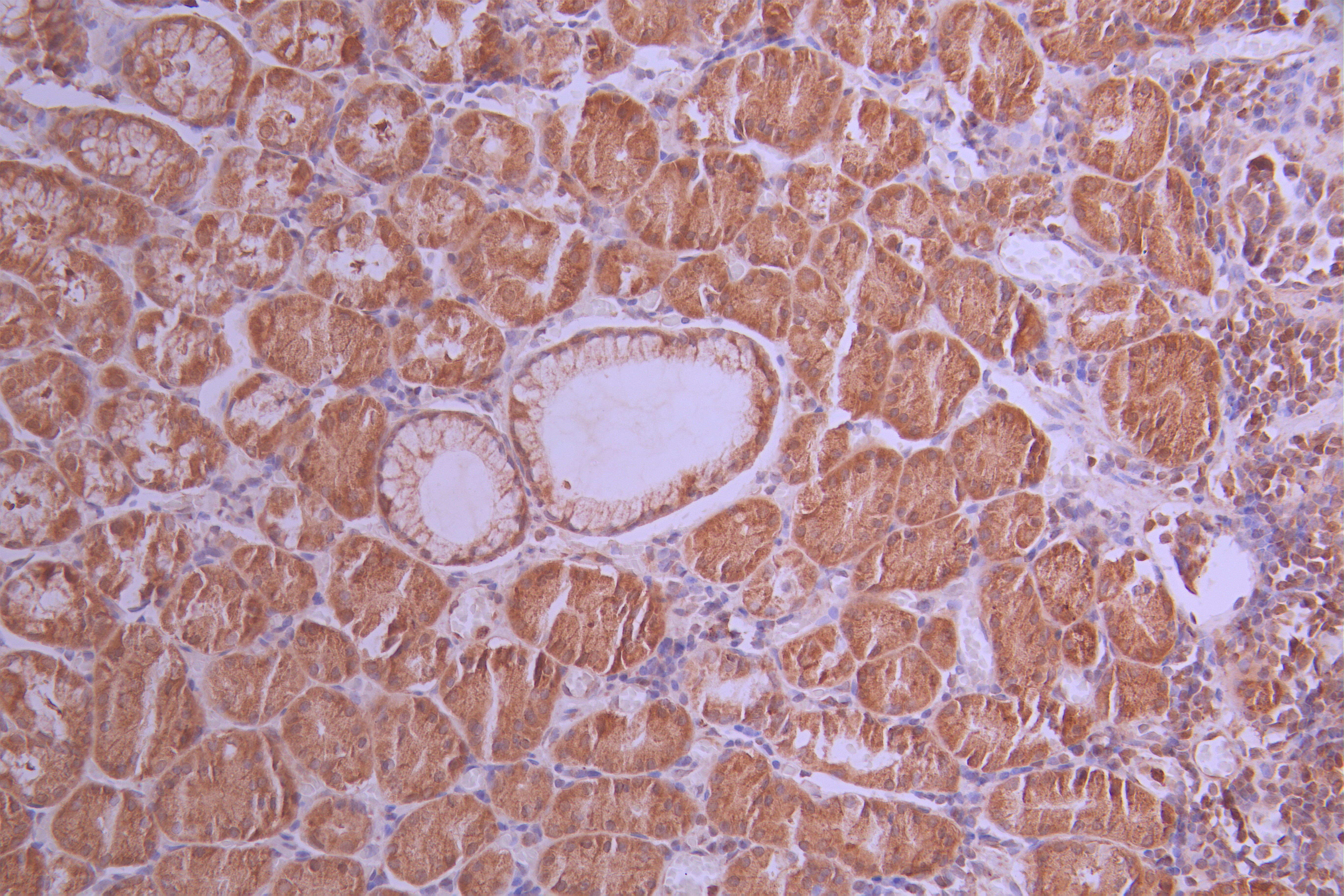 IHC image of CSB-RA297595A0HU diluted at 1:100 and staining in paraffin-embedded human gastric cancer performed on a Leica BondTM system. After dewaxing and hydration, antigen retrieval was mediated by high pressure in a citrate buffer (pH 6.0). Section was blocked with 10% normal goat serum 30min at RT. Then primary antibody (1% BSA) was incubated at 4°C overnight. The primary is detected by a Goat anti-rabbit polymer IgG labeled by HRP and visualized using 0.05% DAB.