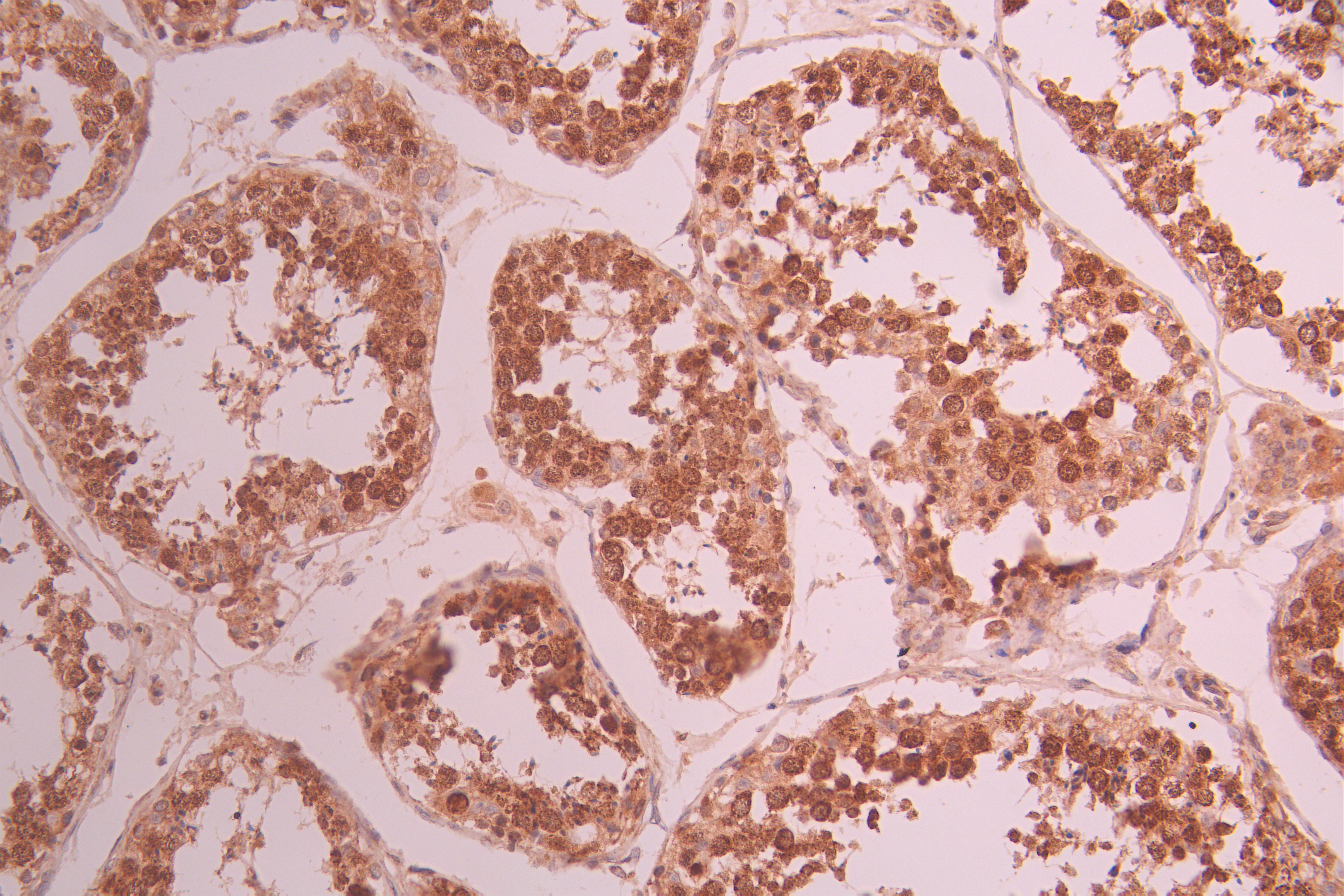 IHC image of CSB-RA297595A0HU diluted at 1:100 and staining in paraffin-embedded human testis tissue performed on a Leica BondTM system. After dewaxing and hydration, antigen retrieval was mediated by high pressure in a citrate buffer (pH 6.0). Section was blocked with 10% normal goat serum 30min at RT. Then primary antibody (1% BSA) was incubated at 4°C overnight. The primary is detected by a Goat anti-rabbit polymer IgG labeled by HRP and visualized using 0.05% DAB.