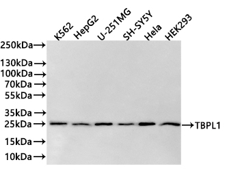 Positive WB detected in: K562 whole cell lysate(20μg), HepG2 whole cell lysate(20μg), U251MG whole cell lysate(20μg), SH-SY5Y whole cell lysate(20μg), Hela whole cell lysate(20μg), 293T whole cell lysate(20μg)