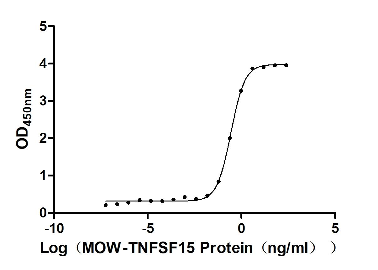 Activity: Measured by its binding ability in a functional ELISA. Immobilized Anti-TNFSF15 recombinant antibody at 2 μg/mL can bind Biotinylated Macaca mulatta TNFSF15 (CSB-MP5305MOW-B). The EC50 is 0.2589-0.3025 ng/mL. -