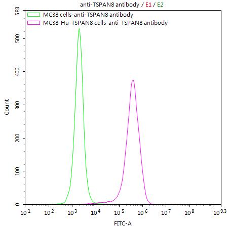 Untransfected MC38 cells (green line) and transfected Human TSPAN8 MC38 stable cells (red line) were stained with anti-TSPAN8 antibody (CSB-RA025166MA2HU) (2μg/1*106cells), washed and then followed by FITC-conjugated anti-Human IgG Fc antibody and analyzed with flow cytometry.