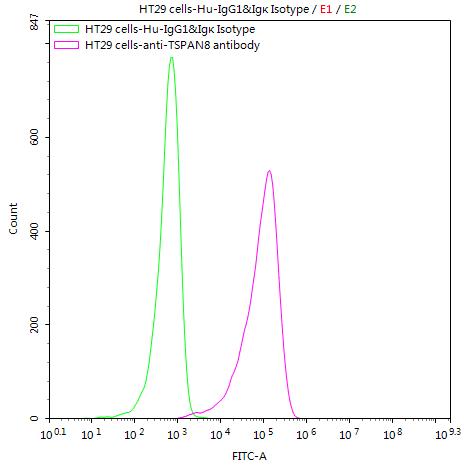 HT29 cells were stained with Human IgG1&Igκ Isotype Control (CSB-RA011156MA1HU)(green line) and anti-TSPAN8 antibody (CSB-RA025166MA2HU) (2μg/1*106cells) (red line), washed and then followed by FITC-conjugated anti-Human IgG Fc antibody and analyzed with flow cytometry.