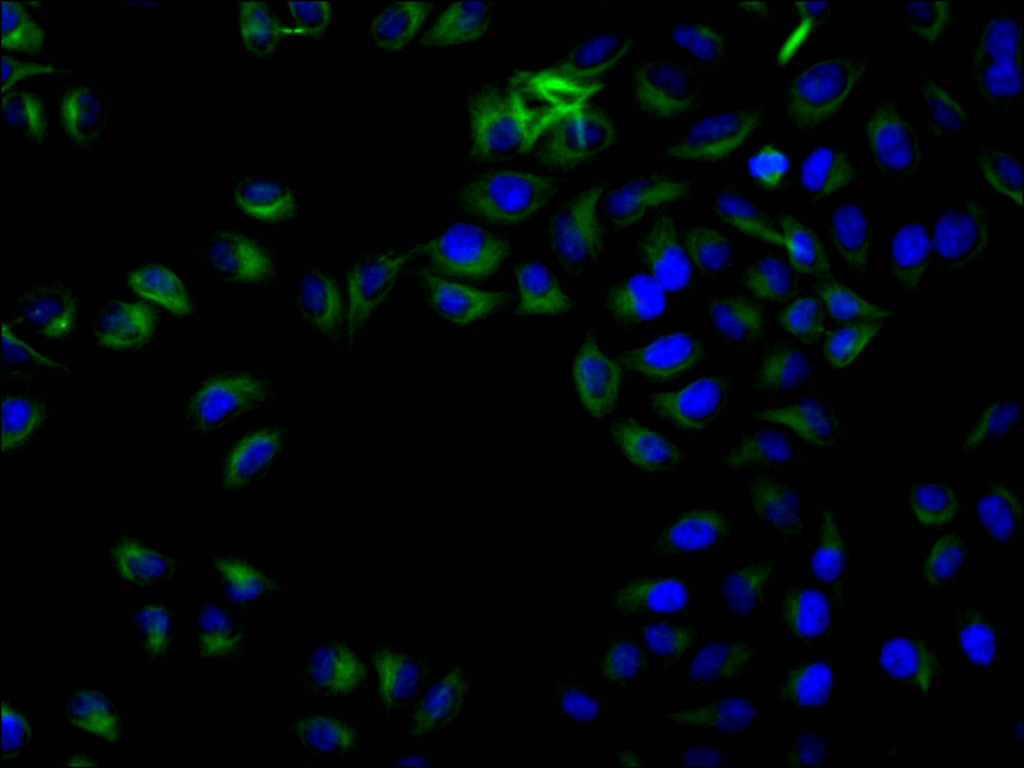 Immunofluorescence?staining?of?Hela?cell?with?CSB-RA025318MA1HU?at?1:100,?counter-stained?with?DAPI.?The?cells?were?fixed?in?4%?formaldehyde?and?blocked?in?10%?normal?Goat?Serum.?The?cells?were?then?incubated?with?the?antibody?overnight?at?4C.?The?secondary?antibody?was?FITC-conjugated?AffiniPure?Goat?Anti-Human?IgG(H+L).