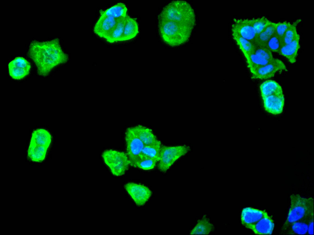 Immunofluorescence?staining?of?MCF7?cell?with?CSB-RA025833MA1HU?at?1:30,?counter-stained?with?DAPI.?The?cells?were?fixed?in?4%?formaldehyde?and?blocked?in?10%?normal?Goat?Serum.?The?cells?were?then?incubated?with?the?antibody?overnight?at?4C.?The?secondary?antibody?was?FITC-conjugated?AffiniPure?Goat?Anti-Rabbit?IgG(H+L).