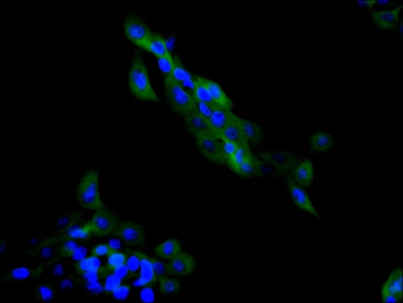 Immunofluorescence staining of A431 cell with CSB-RA616077A0HU at 1:20, counter-stained with DAPI. The cells were fixed in 4% formaldehyde and and permeated by 0.2% TritonX-100 for 15 min. Then 10% normal goat serum to block non-specific protein-protein interactions . The cells were then incubated with the antibody overnight at 4℃. The secondary antibody was Alexa Fluor 488-congugated AffiniPure Goat Anti-Rabbit IgG(H+L).
