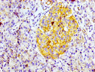 IHC image of CSB-RA004973A0HU diluted at 1:100 and staining in paraffin-embedded human pancreatic tissue performed on a Leica BondTM system. After dewaxing and hydration, antigen retrieval was mediated by high pressure in a citrate buffer (pH 6.0). Section was blocked with 10% normal goat serum 30min at RT. Then primary antibody (1% BSA) was incubated at 4℃ overnight. The primary is detected by a biotinylated secondary antibody and visualized using an HRP conjugated SP system.