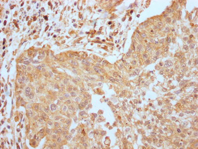 IHC image of CSB-RA794061A0HU diluted at 1:100 and staining in paraffin-embedded human cervical cancer performed on a Leica BondTM system. After dewaxing and hydration, antigen retrieval was mediated by high pressure in a citrate buffer (pH 6.0). Section was blocked with 10% normal goat serum 30min at RT. Then primary antibody (1% BSA) was incubated at 4℃ overnight. The primary is detected by a Goat anti-rabbit IgG polymer labeled by HRP and visualized using 0.05% DAB.