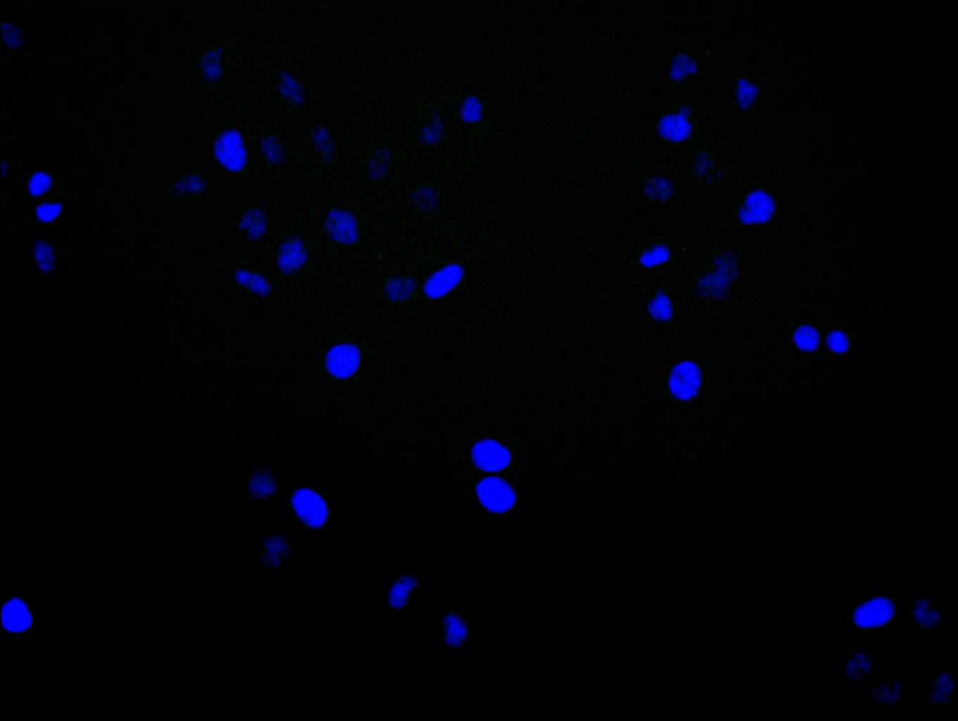 Immunofluorescence staining of Hela cell with CSB-RA575353A0HU at 1:30, counter-stained with DAPI. The cells were fixed in 4% formaldehyde and blocked in 10% normal Goat Serum. The cells were then incubated with the antibody overnight at 4C. The secondary antibody was Alexa Fluor 488-congugated AffiniPure Goat Anti-Rabbit IgG(H+L).
