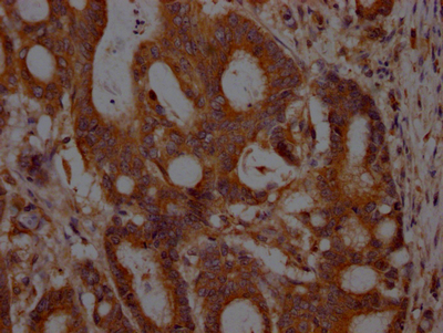 IHC image of CSB-RA634199A0HU diluted at 1:100 and staining in paraffin-embedded human colon cancer performed on a Leica BondTM system. After dewaxing and hydration, antigen retrieval was mediated by high pressure in a citrate buffer (pH 6.0). Section was blocked with 10% normal goat serum 30min at RT. Then primary antibody (1% BSA) was incubated at 4℃ overnight. The primary is detected by a Goat anti-rabbit IgG polymer labeled by HRP and visualized using 0.05% DAB.