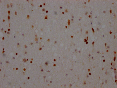 IHC image of CSB-RA273277A0HU diluted at 1:100 and staining in paraffin-embedded human brain tissue performed on a Leica BondTM system. After dewaxing and hydration, antigen retrieval was mediated by high pressure in a citrate buffer (pH 6.0). Section was blocked with 10% normal goat serum 30min at RT. Then primary antibody (1% BSA) was incubated at 4℃ overnight. The primary is detected by a Goat anti-rabbit IgG polymer labeled by HRP and visualized using 0.05% DAB.