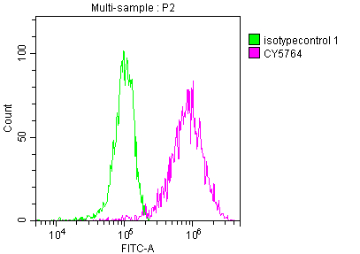 Overlay histogram showing HepG2 cells stained with CSB-RA632595A0HU (red line) at 1:50. The cells were fixed with 70% Ethylalcohol (18h) and then incubated in 10% normal goat serum to block non-specific protein-protein interactions followedby the antibody (1μg/1*106 cells) for 1 h at 4℃.The secondary antibody used was FITC-conjugated goat anti-rabbit IgG (H+L) at 1/200 dilution for 30min at 4℃. Control antibody (green line) was Rabbit IgG (1μg/1*106 cells) used under the same conditions. Acquisition of >10,000 events was performed.