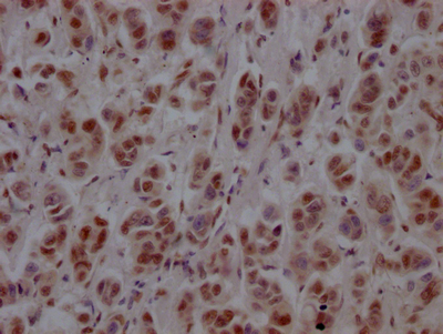 IHC image of CSB-RA987652A0HU diluted at 1:100 and staining in paraffin-embedded human breast cancer performed on a Leica BondTM system. After dewaxing and hydration, antigen retrieval was mediated by high pressure in a citrate buffer (pH 6.0). Section was blocked with 10% normal goat serum 30min at RT. Then primary antibody (1% BSA) was incubated at 4℃ overnight. The primary is detected by a Goat anti-rabbit IgG polymer labeled by HRP and visualized using 0.05% DAB.