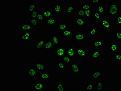 Immunofluorescence staining of Hela cells with CSB-RA020470A421phHU at 1:100,counter-stained with DAPI. The cells were fixed in 4% formaldehyde, permeabilized using 0.2% Triton X-100 and blocked in 10% normal Goat Serum. The cells were then incubated with the antibody overnight at 4℃. The secondary antibody was Alexa Fluor 488-congugated AffiniPure Goat Anti-Rabbit IgG (H+L).