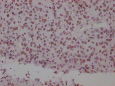 IHC image of CSB-RA149196A0HU diluted at 1:100 and staining in paraffin-embedded human glioma cancer performed on a Leica BondTM system. After dewaxing and hydration, antigen retrieval was mediated by high pressure in a citrate buffer (pH 6.0). Section was blocked with 10% normal goat serum 30min at RT. Then primary antibody (1% BSA) was incubated at 4℃ overnight. The primary is detected by a Goat anti-rabbit IgG polymer labeled by HRP and visualized using 0.05% DAB.