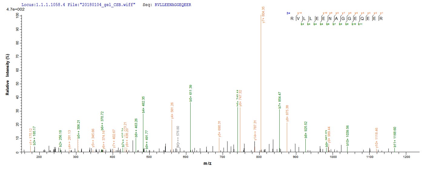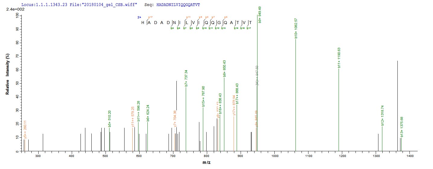Based on the SEQUEST from database of E.coli host and target protein, the LC-MS/MS Analysis result of CSB-EP331779ANE(A4) could indicate that this peptide derived from E.coli-expressed Arachis hypogaea (Peanut) N/A.