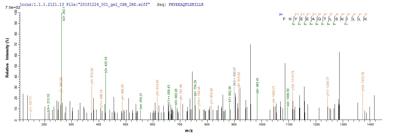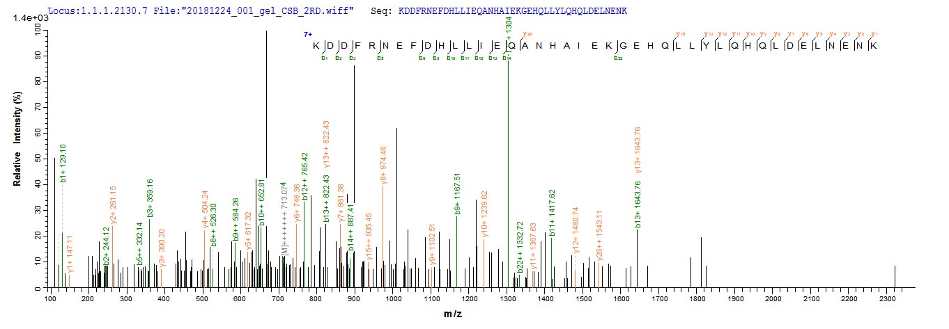 Based on the SEQUEST from database of E.coli host and target protein, the LC-MS/MS Analysis result of CSB-EP527280BTN could indicate that this peptide derived from E.coli-expressed Blomia tropicalis (Mite) BLOT5.
