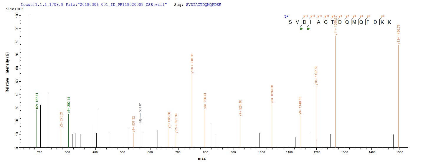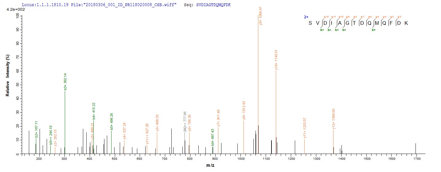 Based on the SEQUEST from database of Yeast host and target protein, the LC-MS/MS Analysis result of CSB-YP358313BTY could indicate that this peptide derived from Yeast-expressed Bordetella bronchiseptica (strain ATCC BAA-588 / NCTC 13252 / RB50) (Alcaligenes bronchisepticus) BB3856.